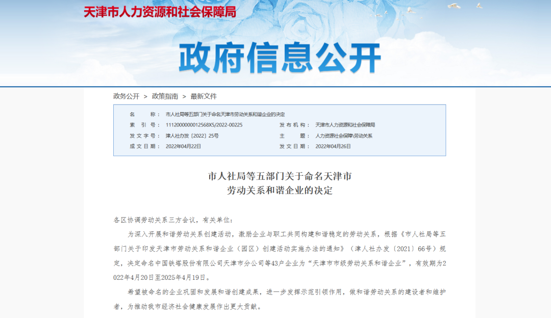 2022年4月26日,天津市人力资源和社会保障局发布了《市人社局等五部门关于命名天津市劳动关系和谐企业的决定》,命名天津HTH.COM-华体会物联科技股份有限公司等43户企业为“天津市市级劳动关系和谐企业”,有效期为2022年4月20日至2025年4月19日。